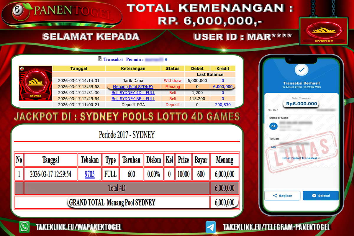 Selamat Kepada User ID : MAR**** Member PANENTOGEL JACKPOT TOGEL SYDNEY LOTTO