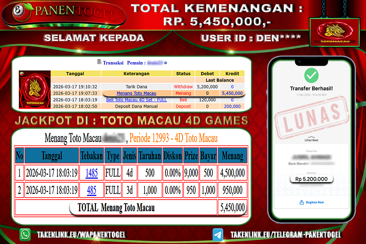 Selamat Kepada User ID : DEN**** Member PANENTOGEL JACKPOT TOGEL TOTO MACAU 4D GAMES