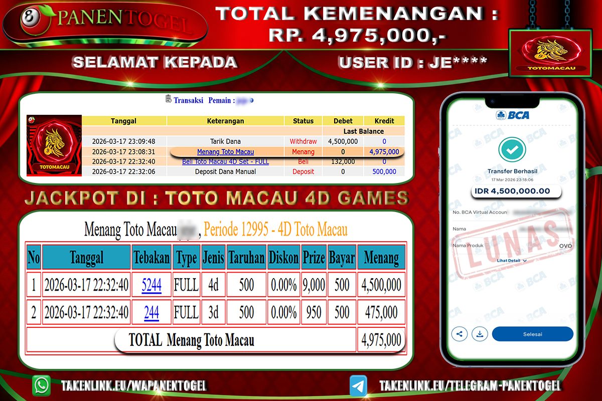 Selamat Kepada User ID : JE**** Member PANENTOGEL JACKPOT TOGEL TOTO MACAU 4D GAMES
