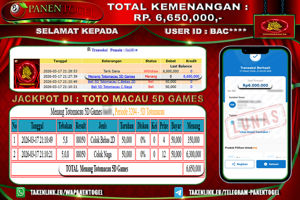 BUKTI KEMENANGAN TOGEL TOTO MACAU 5D GAMES PANENTOGEL Rp. 6.650.000, - LUNAS
