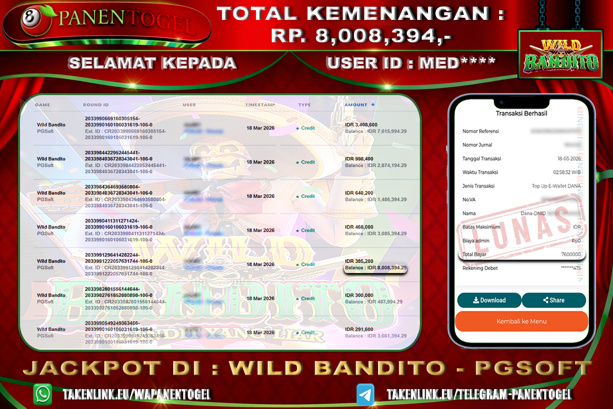 Selamat Kepada User ID : MED**** Member PANENTOGEL JACKPOT WILD BANDITO