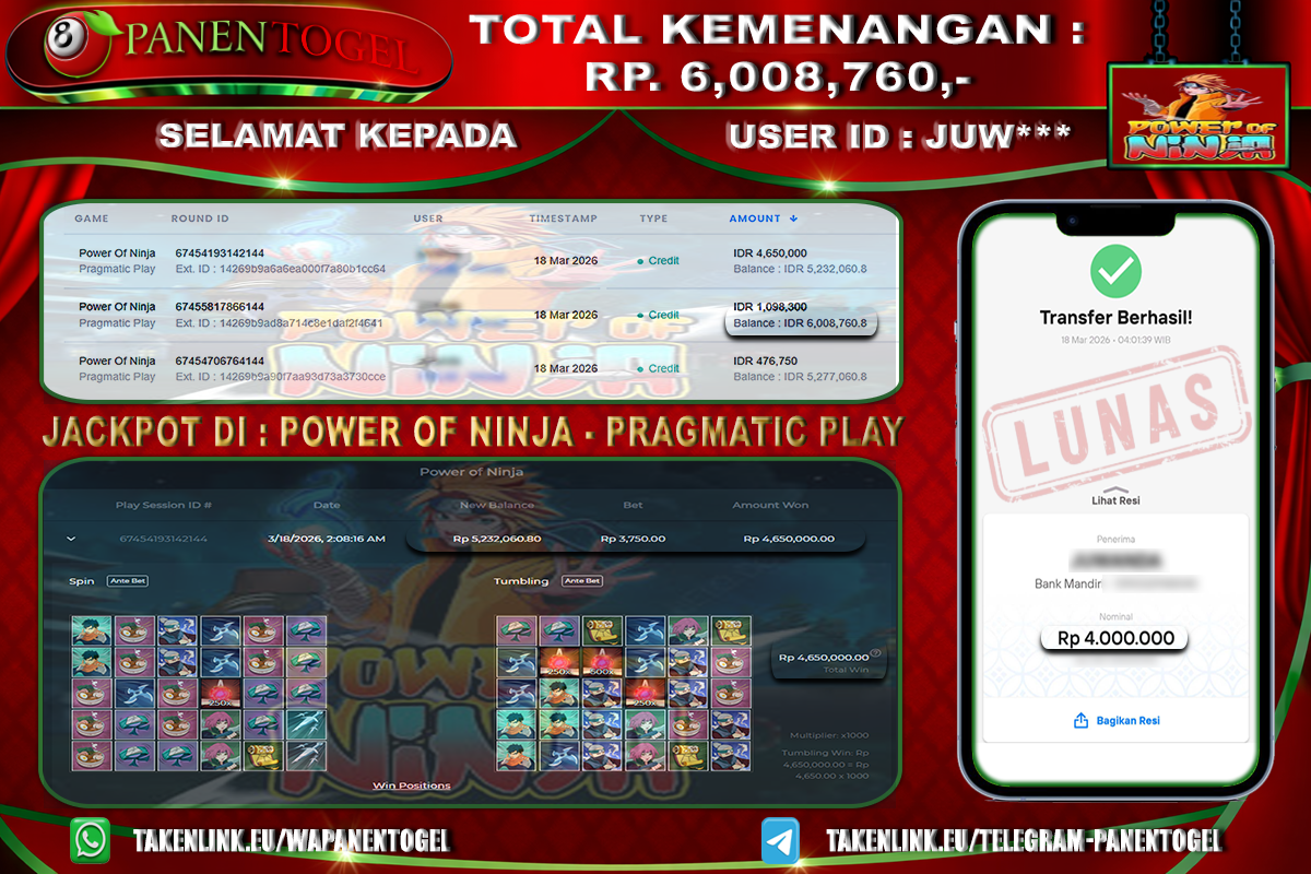 Selamat Kepada User ID : JUW**** Member PANENTOGEL JACKPOT POWER OF NINJA