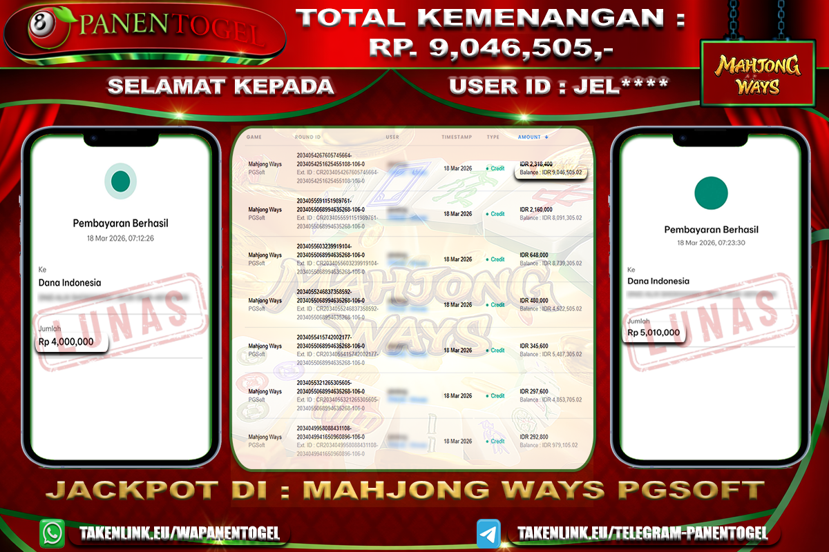 Selamat Kepada User ID : JEL**** Member PANENTOGEL JACKPOT MAHJONG WAYS