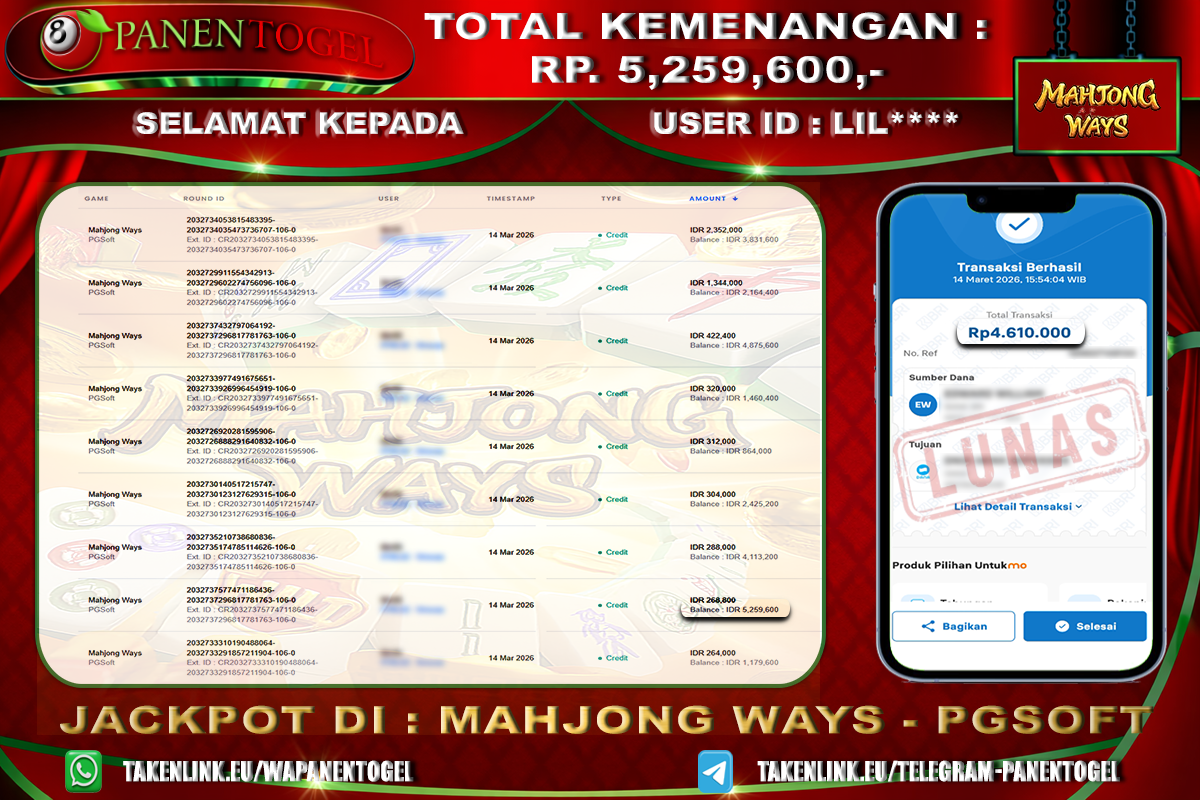 Selamat Kepada User ID : LIL**** Member PANENTOGEL JACKPOT MAHJONG WAYS