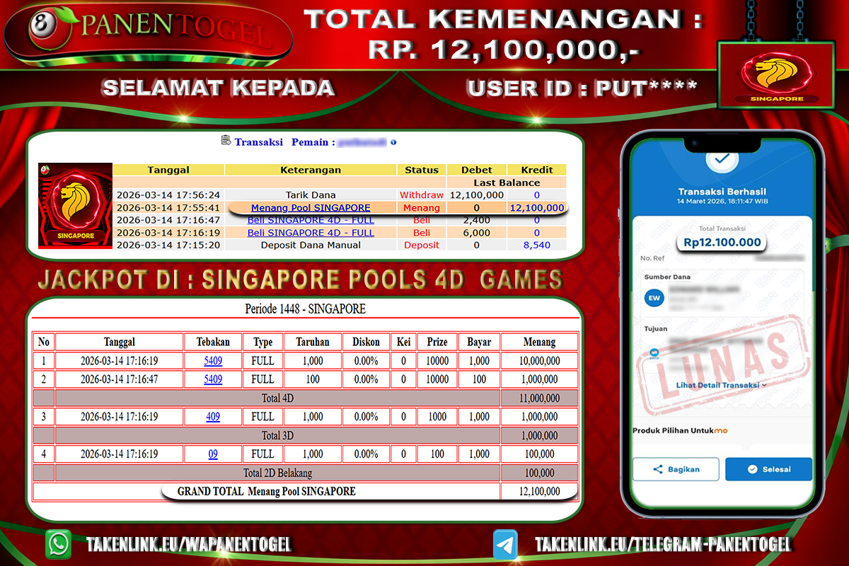 BUKTI KEMENANGAN TOGEL SINGAPORE POOLS 4D GAMES PANENTOGEL Rp. 12.100.000, - LUNAS