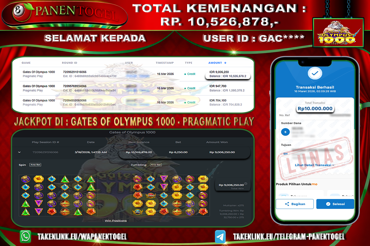 Selamat Kepada User ID : GAC**** Member PANENTOGEL JACKPOT GATES OF OLYMPUS 1000
