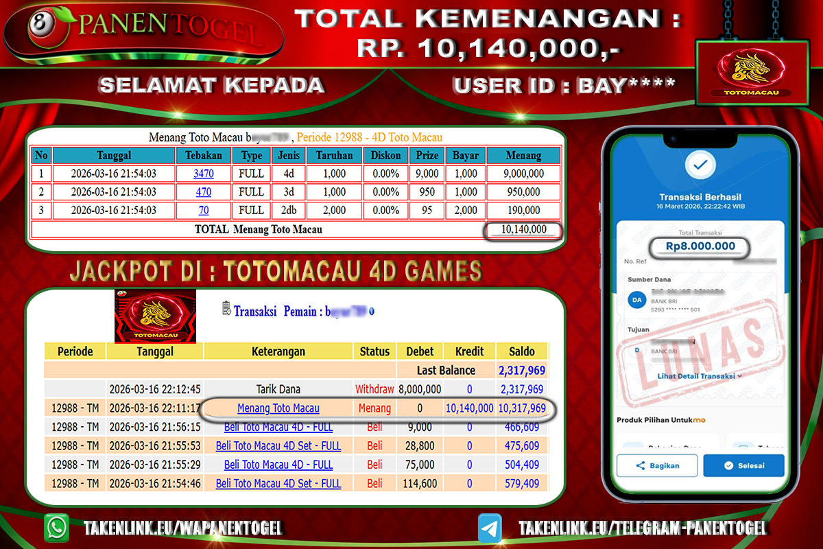 Update terkini bukti jackpot • Testimoni member • Bukti transaksi real dari toto togel online PANENTOGEL.