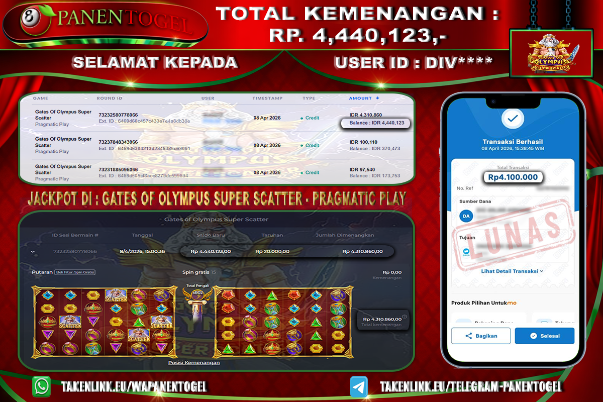 Selamat Kepada User ID : DIV**** Member PANENTOGEL JACKPOT SLOT GATES OF OLYMPUS SUPER SCATTER