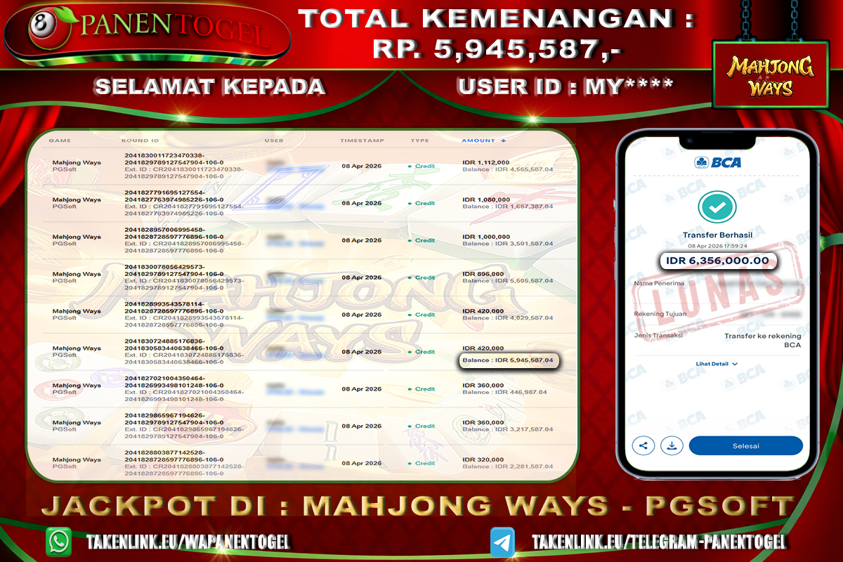 Beberapa situs togel online hanya menjanjikan tanpa ada bukti yang jelas, tapi di PANENTOGEL semua pasti terbukti dan jelas, bukti jackpot toto togel online gacor secara nyata. Melalui kemenangan member setiap hari nya, jackpot besar togel online 2D–3D–4D maupun jackpot besar slot gacor, hingga bukti transaksi kemenangan yang benar-benar masuk ke saldo member.