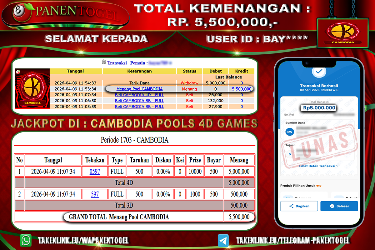 Selamat Kepada User ID : BAY**** Member PANENTOGEL JACKPOT TOGEL CAMBODIA POOLS 4D GAMES