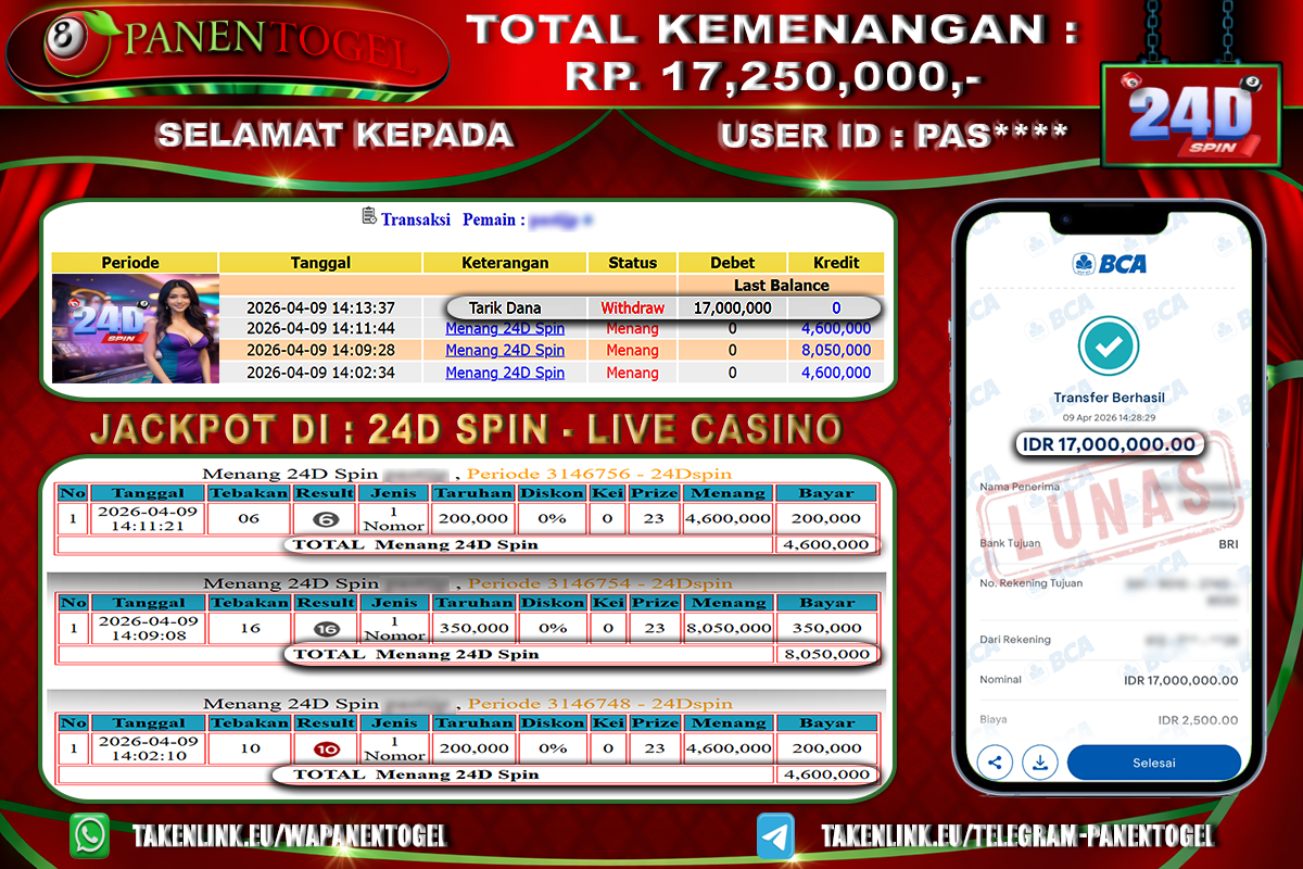 Selamat Kepada User ID : PAS**** Member PANENTOGEL JACKPOT LIVE CASINO 24D SPIN