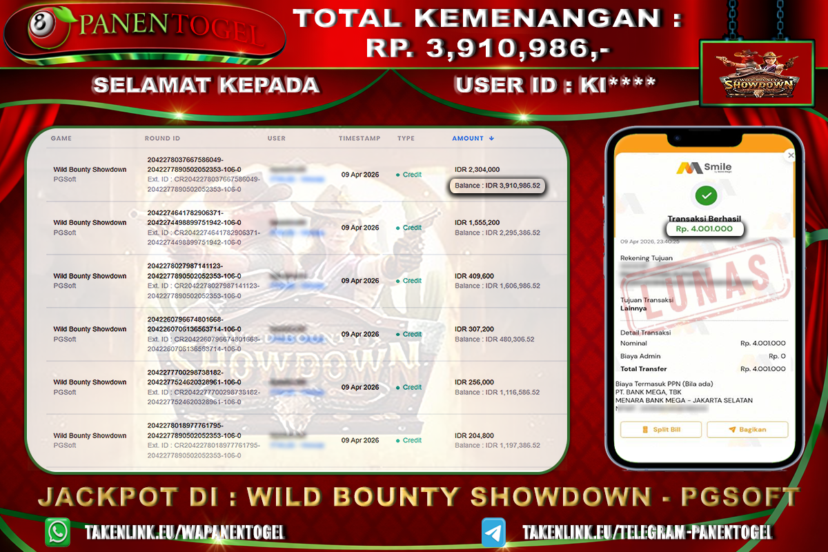 Selamat Kepada User ID : KI**** Member PANENTOGEL JACKPOT WILD BOUNTY SHOWDOWN