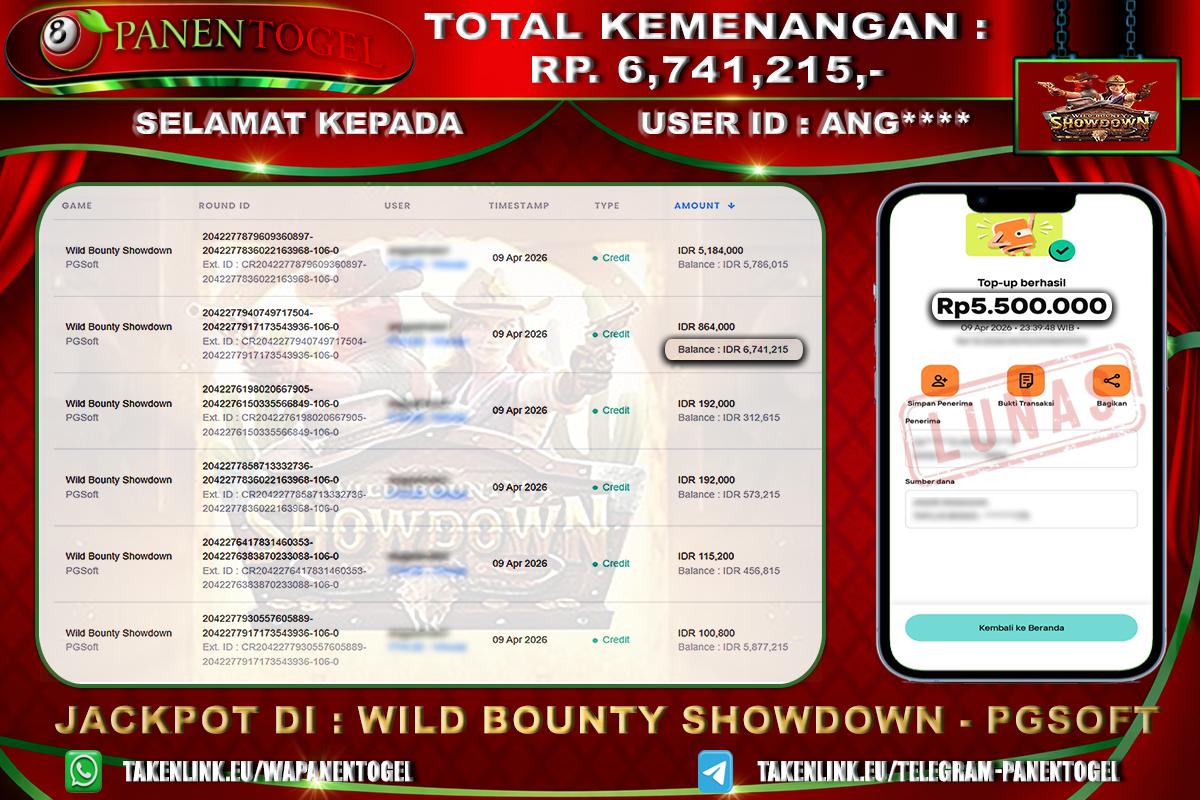 Selamat Kepada User ID : ANG**** Member PANENTOGEL JACKPOT WILD BOUNTY SHOWDOWN