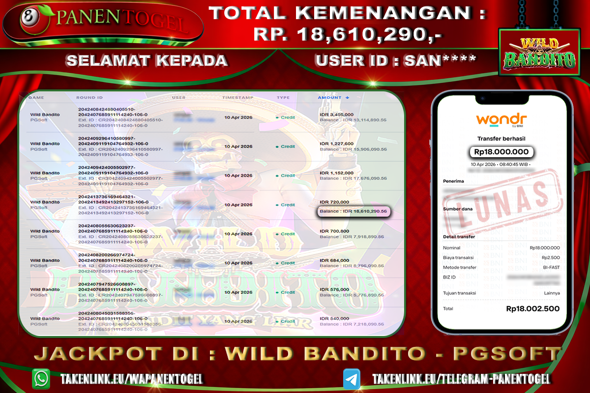 Selamat Kepada User ID : SAN**** Member PANENTOGEL JACKPOT WILD BANDITO