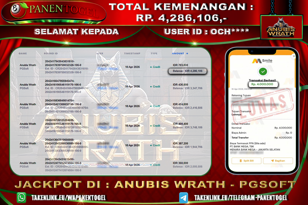 Selamat Kepada User ID : OCH**** Member PANENTOGEL JACKPOT ANUBIS WRATH