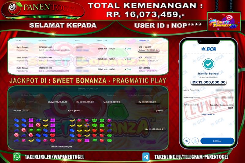 Selamat Kepada User ID : NOP**** Member PANENTOGEL JACKPOT SWEET BONANZA