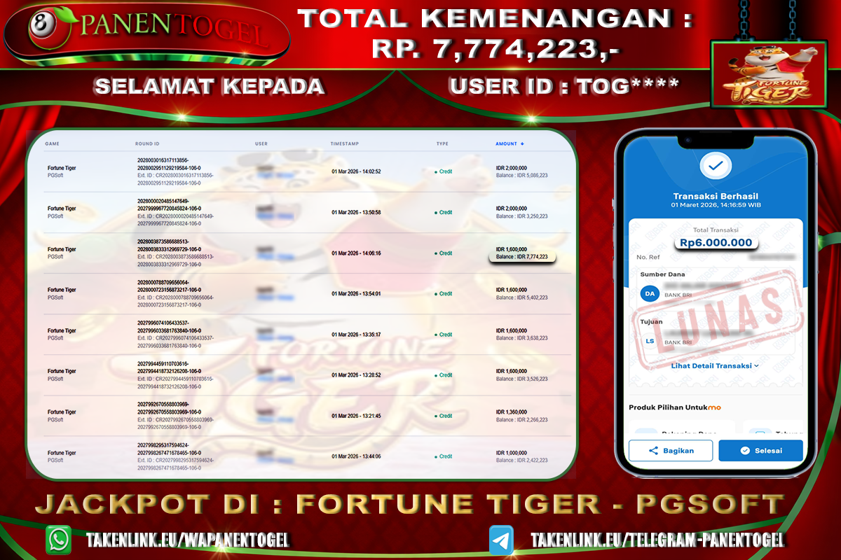Selamat Kepada User ID : TOG**** Member PANENTOGEL JACKPOT FORTUNE TIGER