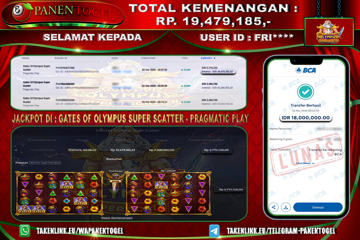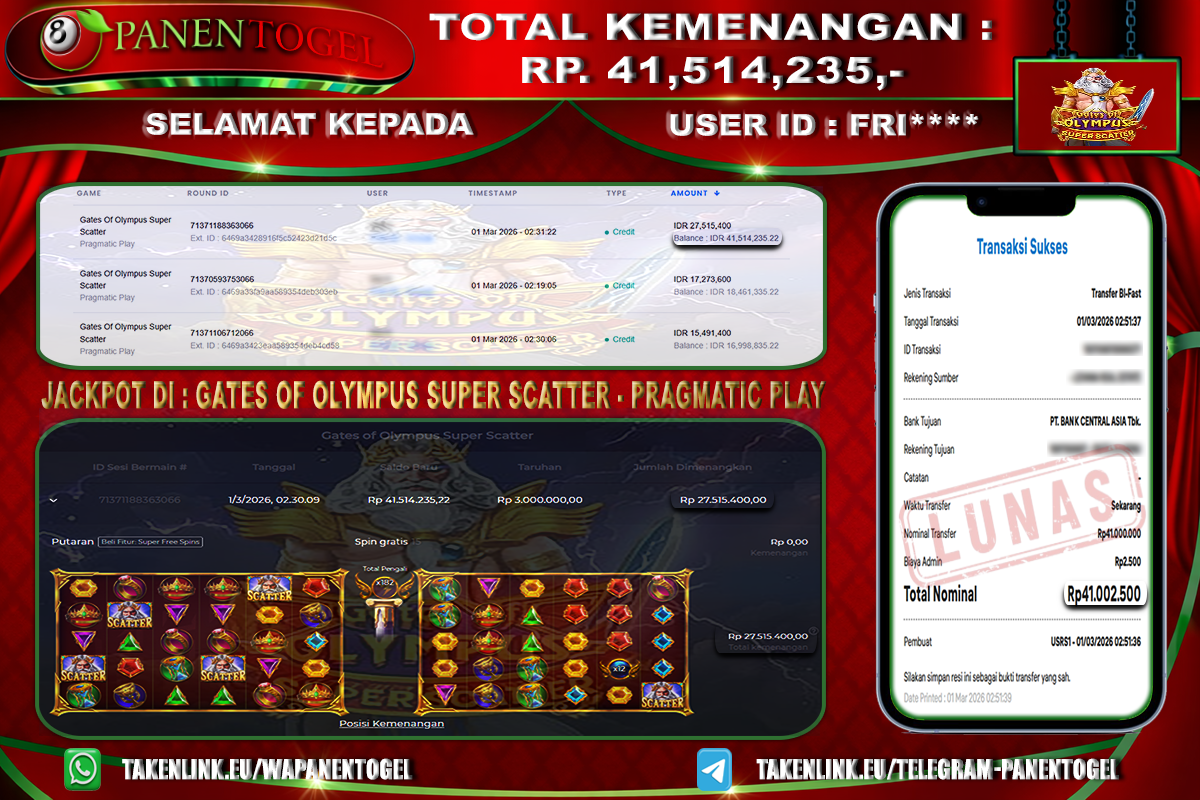 Selamat Kepada User ID : FRI**** Member PANENTOGEL JACKPOT GATES OF OLYMPUS SUPER SCATTER