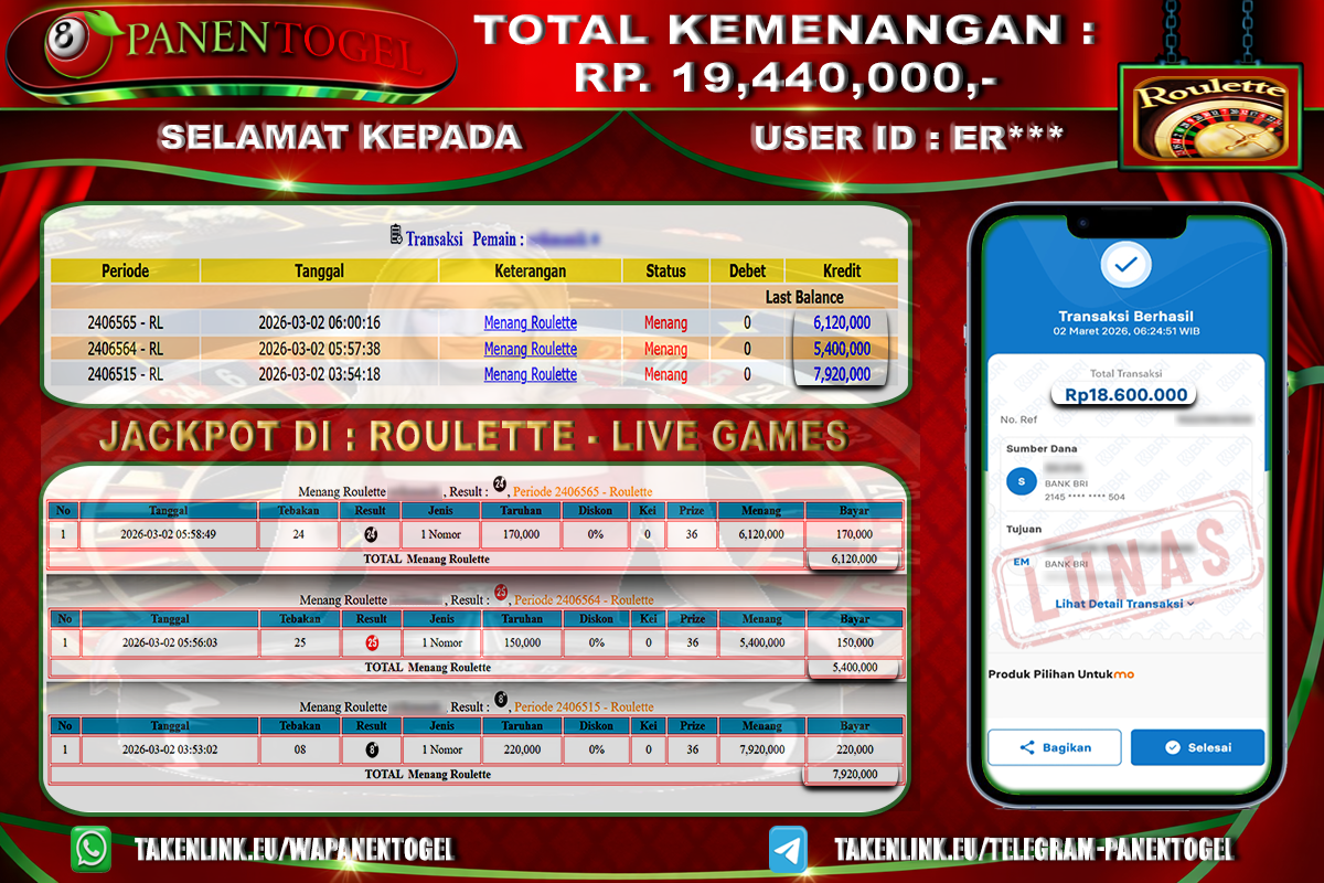Selamat Kepada User ID : ER**** Member PANENTOGEL JACKPOT LIVE GAME ROULETTE
