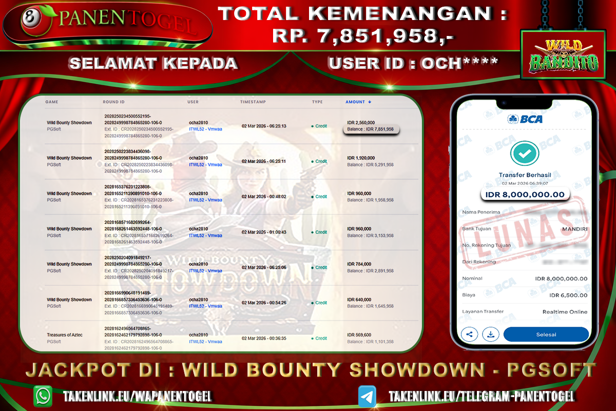 Selamat Kepada User ID : OCH**** Member PANENTOGEL JACKPOT WILD BOUNTY SHOWDOWN