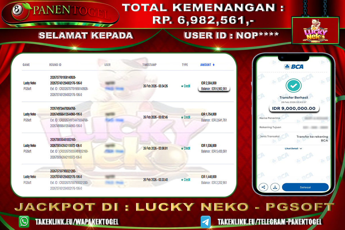 Selamat Kepada User ID : NOP**** Member PANENTOGEL JACKPOT LUCKY NEKO