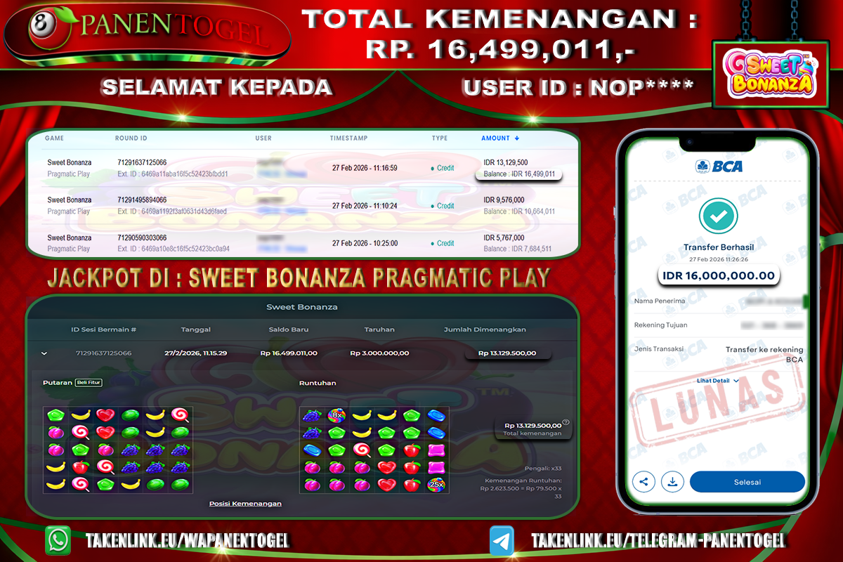 Selamat Kepada User ID : NOP**** Member PANENTOGEL JACKPOT SWEET BONANZA