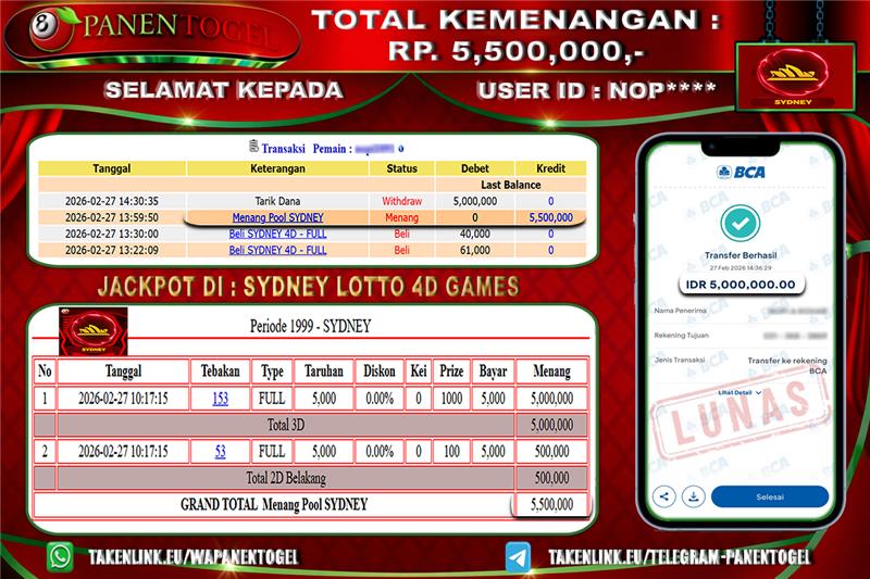 BUKTI KEMENANGAN TOGEL SYDNEY LOTTO 4D GAMES PANENTOGEL Rp. 5.500.000, - LUNAS