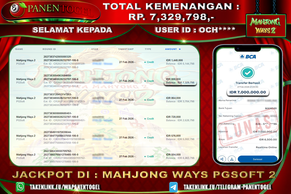 Selamat Kepada User ID : PAS**** Member PANENTOGEL JACKPOT MAHJONG WAYS 2