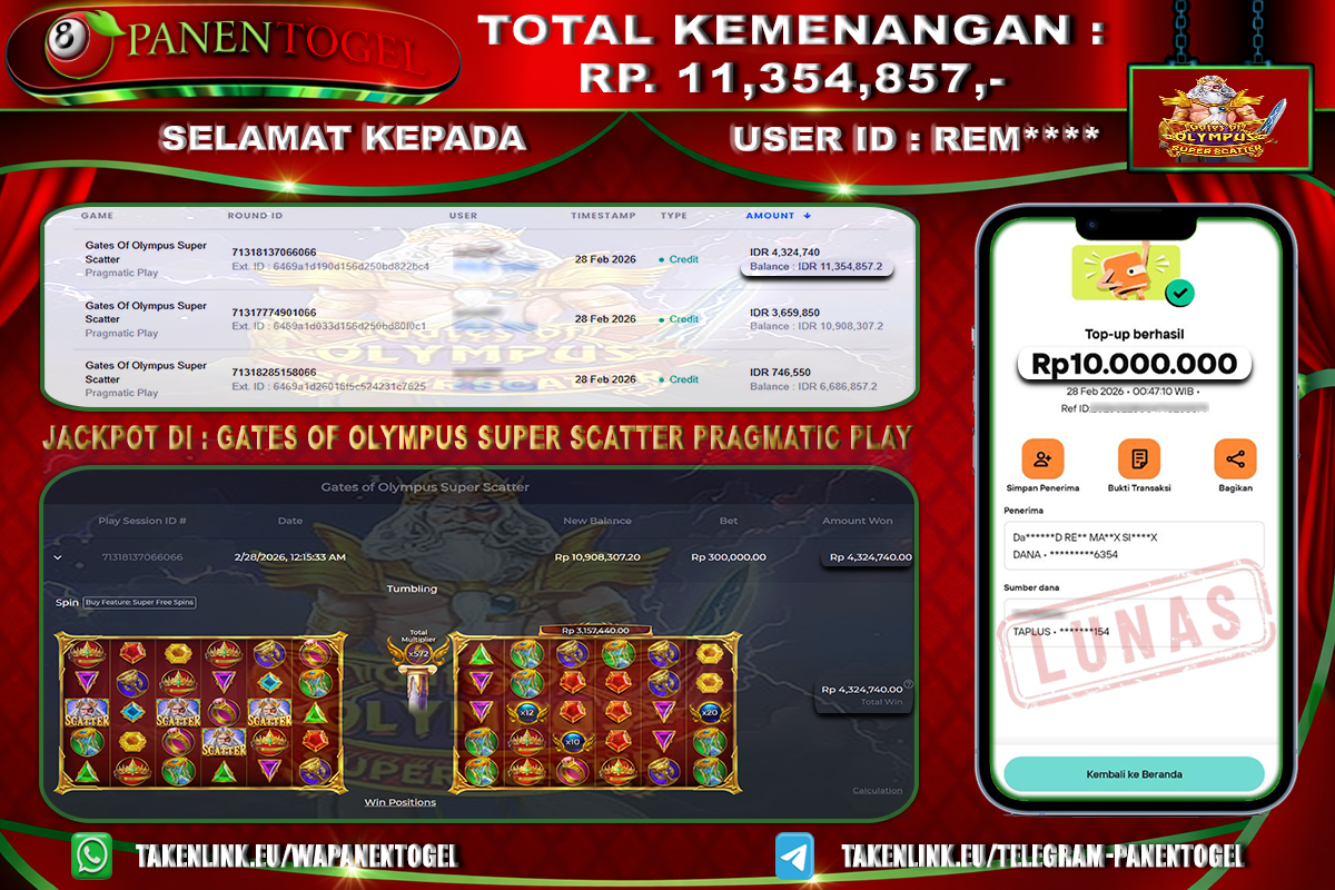 BUKTI KEMENANGAN SLOT PANENTOGEL Rp. 11.354.857, - LUNAS