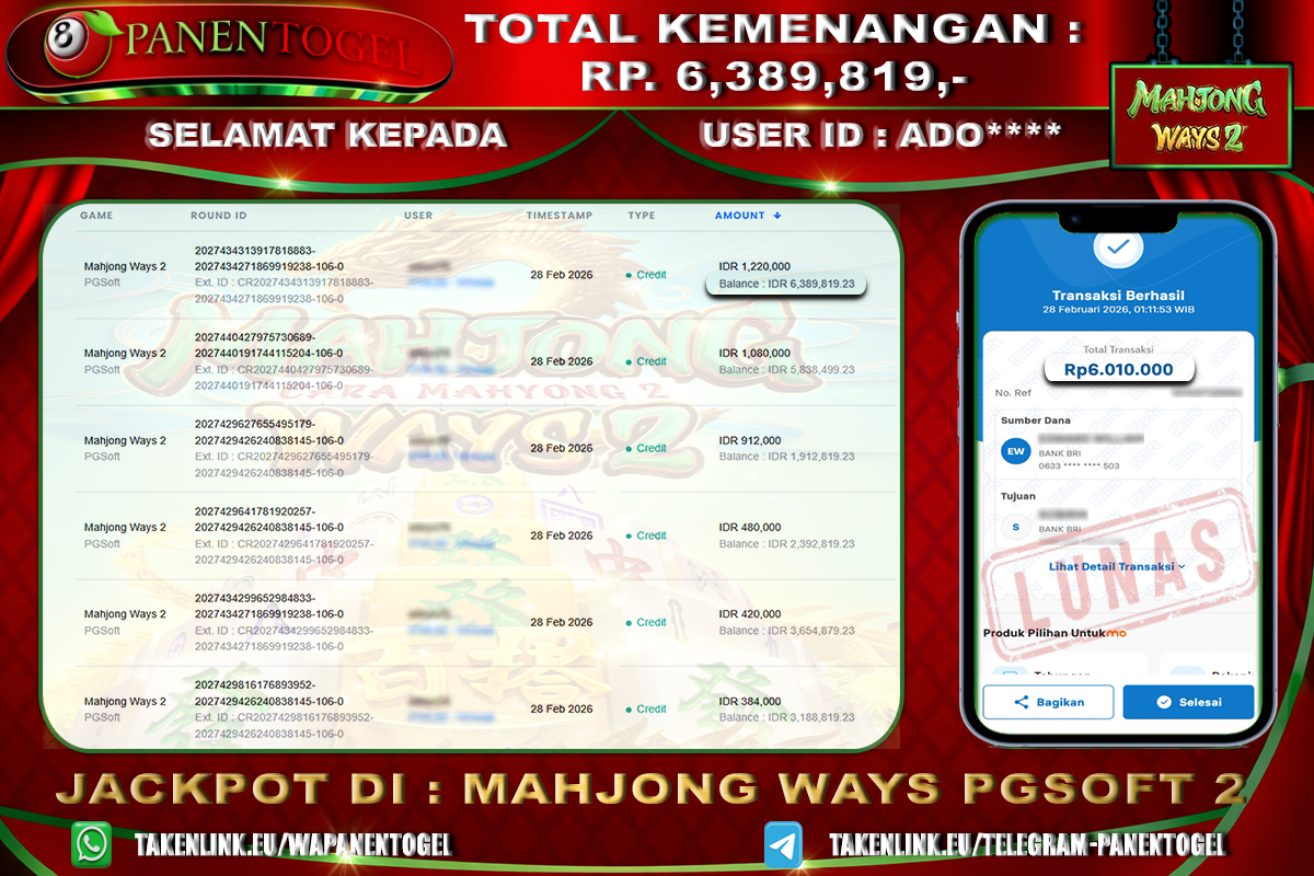 Selamat Kepada User ID : ADO**** Member PANENTOGEL JACKPOT MAHJONG WAYS 2