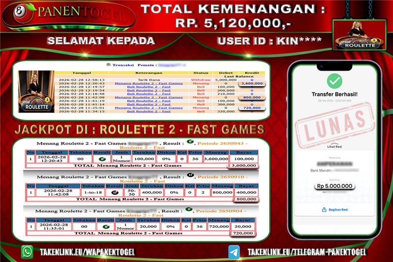 Selamat Kepada User ID : KIN**** Member PANENTOGEL JACKPOT GAME ROULETTE 2 - FAST GAMES
