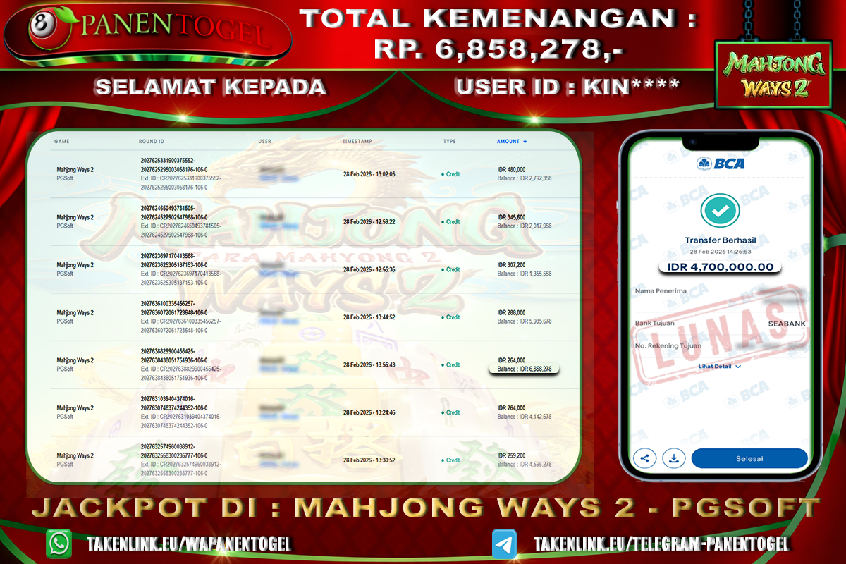 Selamat Kepada User ID : KIN**** Member PANENTOGEL JACKPOT MAHJONG WAYS 2