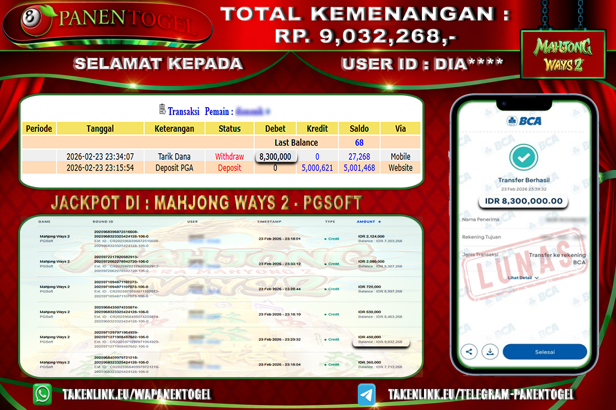 Selamat Kepada User ID : LIM**** Member PANENTOGEL JACKPOT MAHJONG WAYS 2