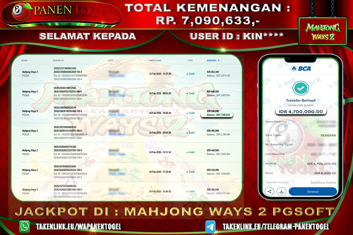 Selamat Kepada User ID : KIN**** Member PANENTOGEL JACKPOT MAHJONG WAYS 2