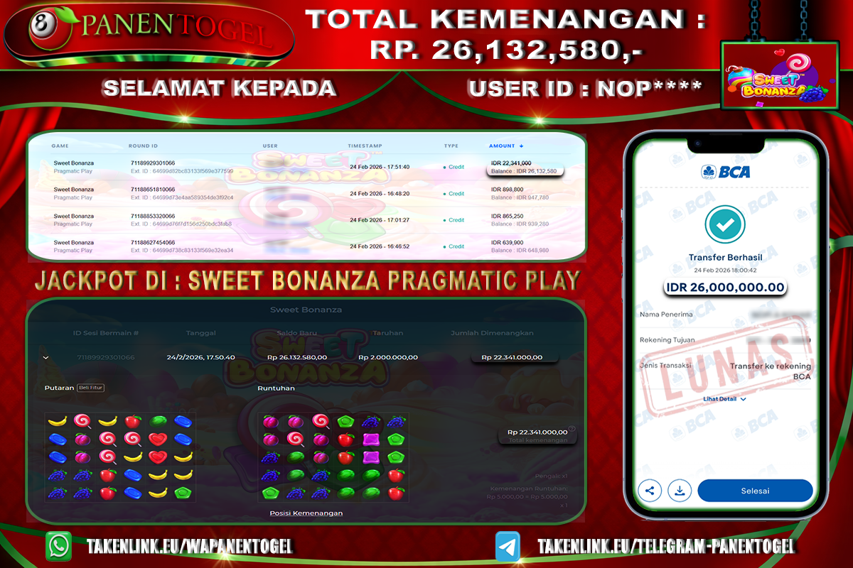 BUKTI KEMENANGAN SLOT PANENTOGEL Rp. 26.132.580, - LUNAS