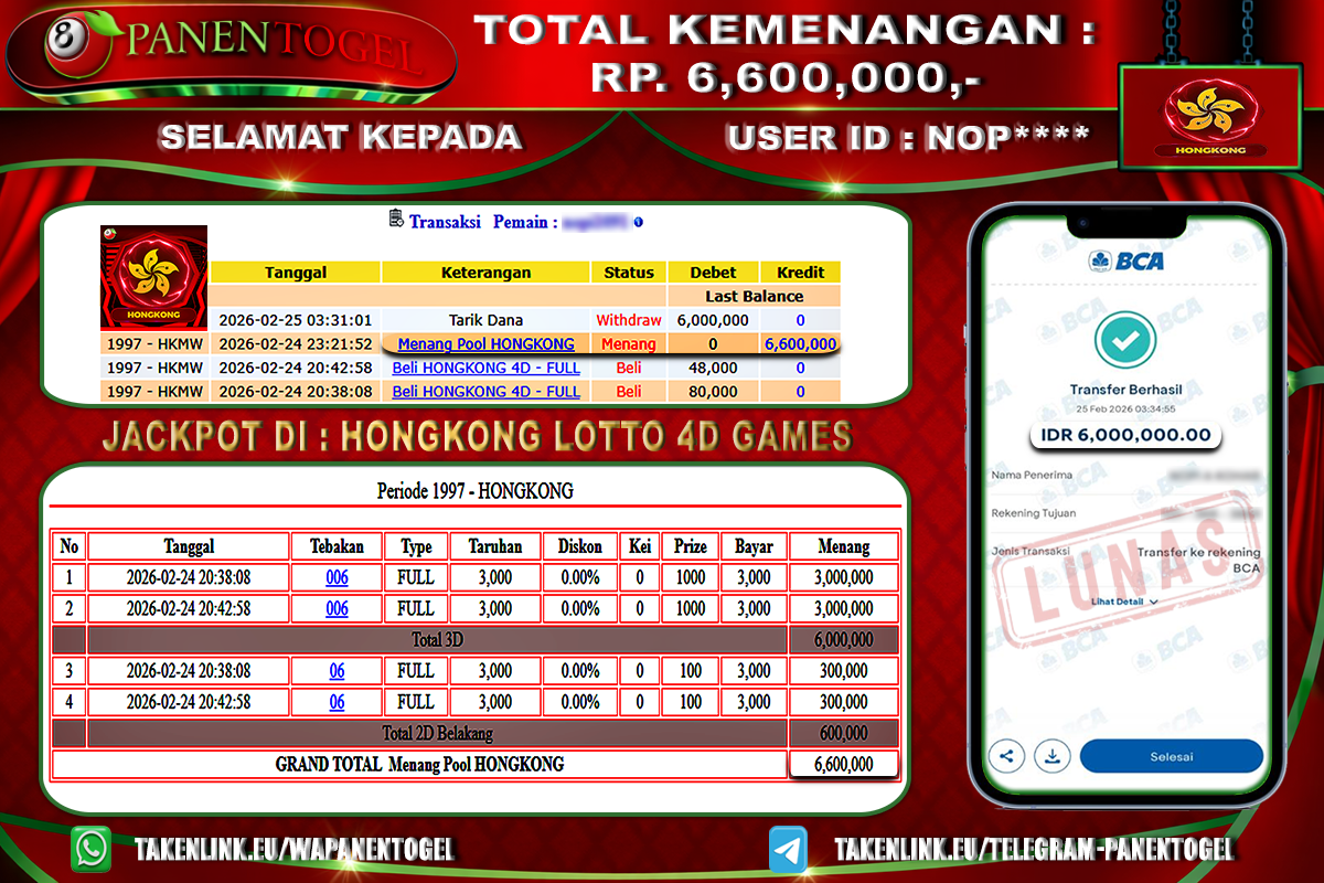 BUKTI KEMENANGAN TOGEL HONGKONG LOTTO 4D GAMES PANENTOGEL Rp. 6.600.000, - LUNAS