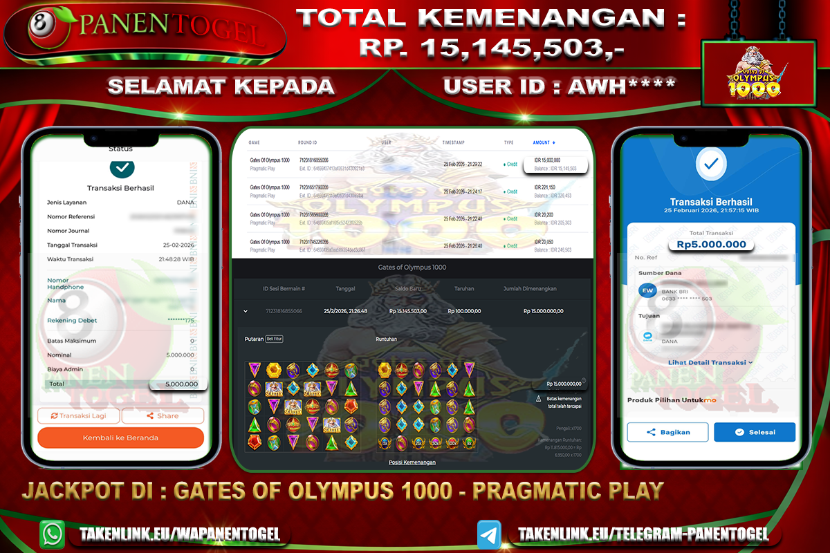 Selamat Kepada User ID : AWH**** Member PANENTOGEL JACKPOT GATES OF OLYMPUS 1000