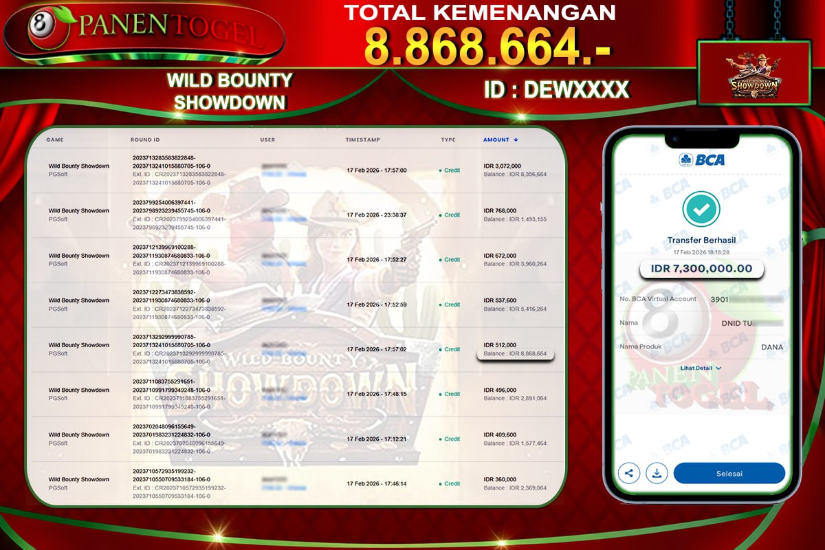 Selamat Kepada User ID : PAN**** Member PANENTOGEL JACKPOT WILD BOUNTY SHOWDOWN