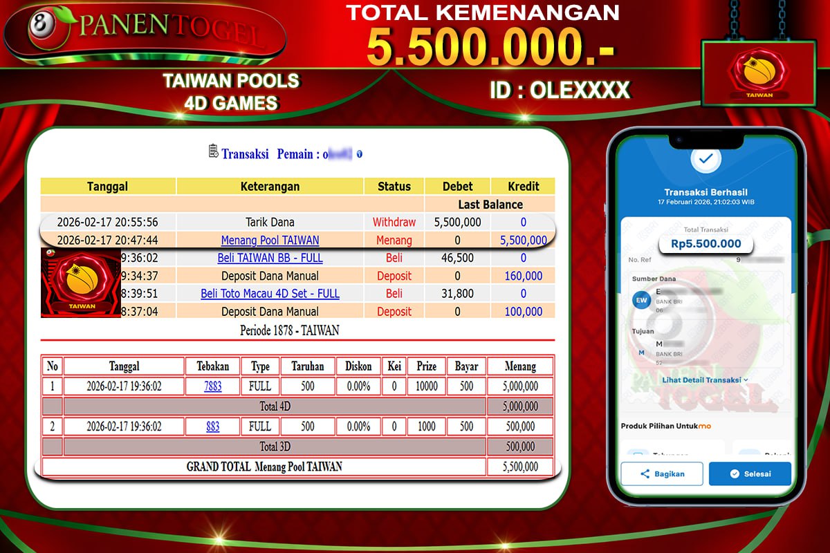 Selamat Kepada User ID : OLE**** Member PANENTOGEL JACKPOT TOGEL TAIWAN POOLS 4D