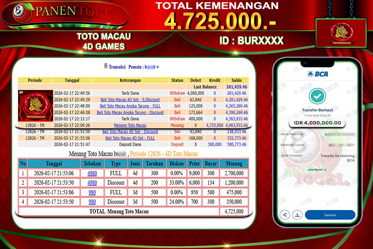 BUKTI KEMENANGAN TOGEL TOTOMACAU PANENTOGEL Rp. 4.725.000, - LUNAS