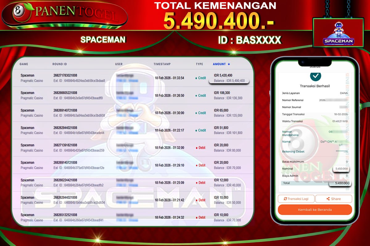 Selamat Kepada User ID : BAS**** Member PANENTOGEL JACKPOT SPACEMAN