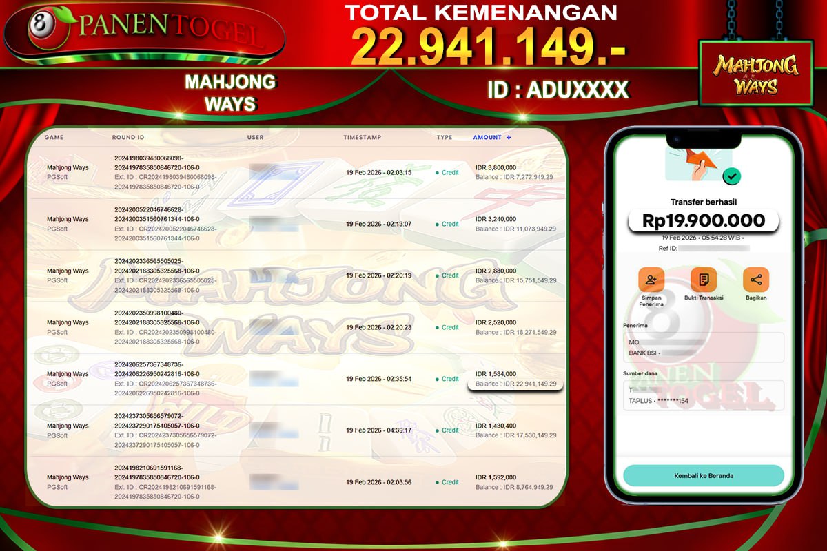 Selamat Kepada User ID : ADU**** Member PANENTOGEL JACKPOT MAHJONG WAYS