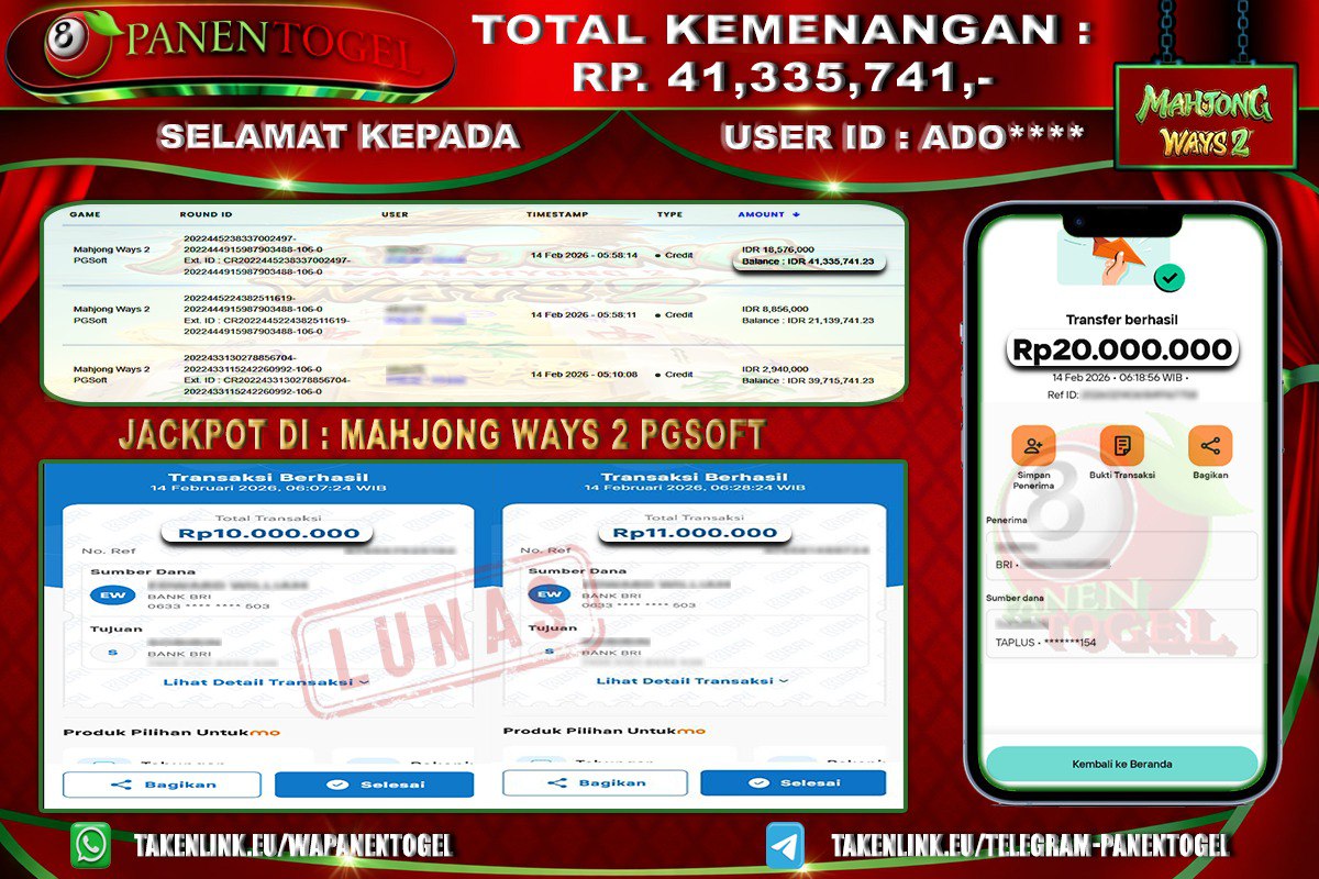 Selamat Kepada User ID : ADO**** Member PANENTOGEL JACKPOT MAHJONG WAYS 2