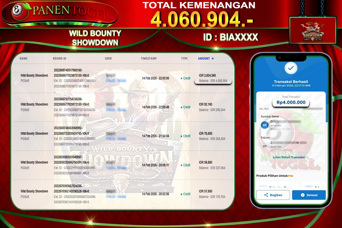 Selamat Kepada User ID : BIA**** Member PANENTOGEL JACKPOT WILD BOUNTY SHOWDOWN