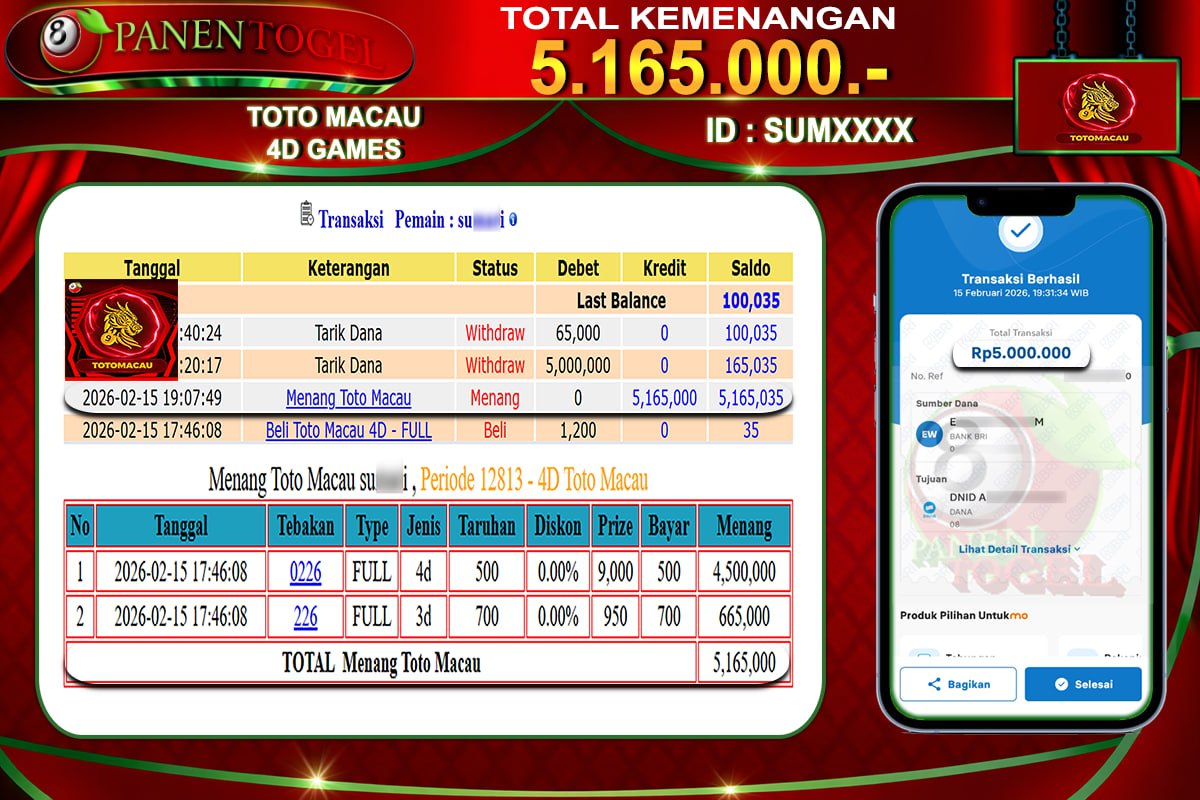 BUKTI KEMENANGAN TOGEL TOTO MACAU 4D PANENTOGEL Rp. 5.165.000, - LUNAS