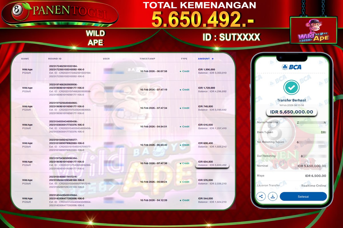 Selamat Kepada User ID : SUT*** Member PANENTOGEL JACKPOT WILD APE