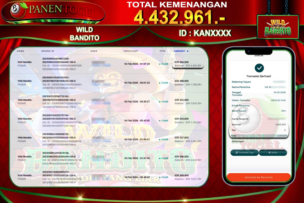 Selamat Kepada User ID : KAN*** Member PANENTOGEL JACKPOT WILD BANDITO