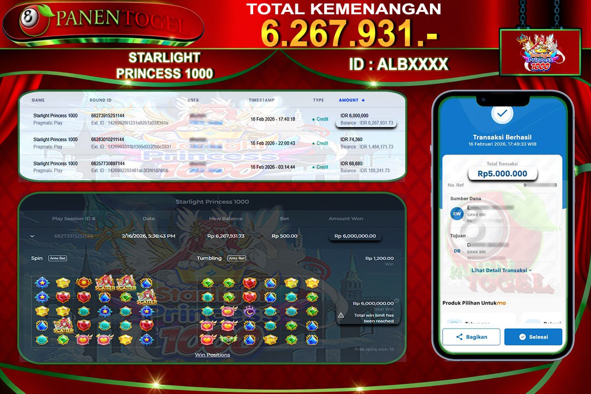 Selamat Kepada User ID : SUT*** Member PANENTOGEL STARLIGHT PRINCESS 1000