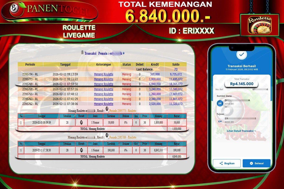 BUKTI KEMENANGAN LIVE GAME ROULETTE PANENTOGEL Rp. 6.840.000, - LUNAS