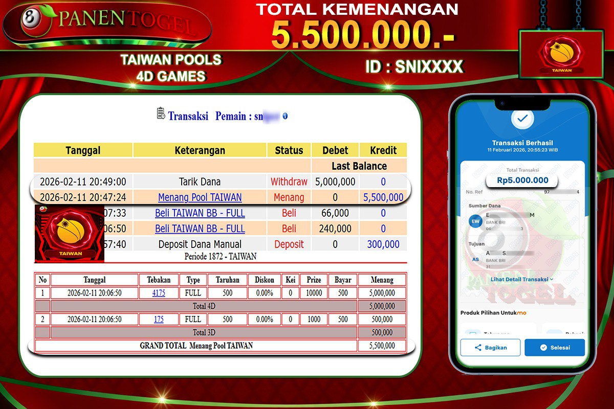 BUKTI KEMENANGAN TOGEL TAIWAN POOLS PANENTOGEL Rp. 5.500.000, - LUNAS